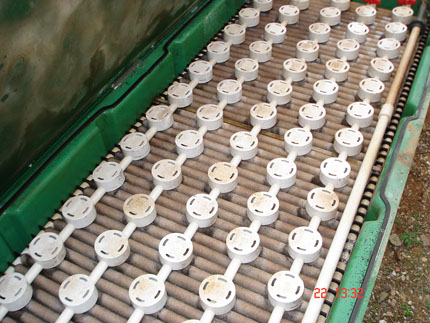 Άποψη του βιολογικού καθαρισμού AdvanTex (κουτί) κατά τις εργασίες συντήρησης. Διακρίνονται οι κλάδοι τροφοδοσίας των λυμάτων και τα μπεκ ψεκασμού.